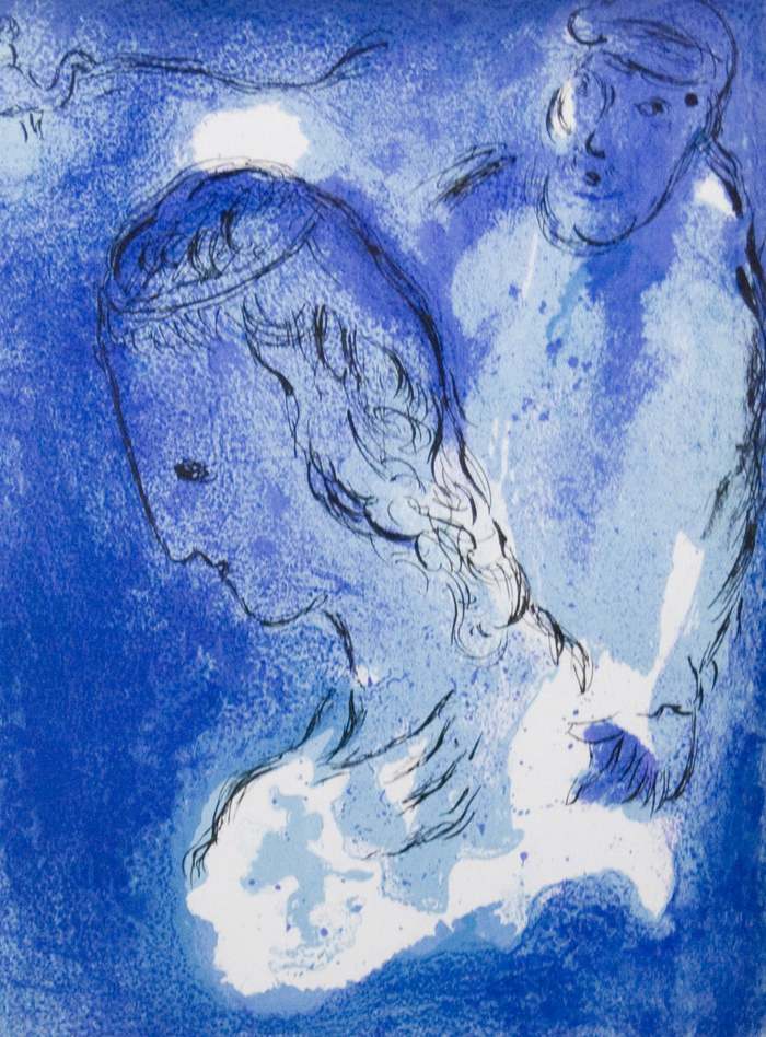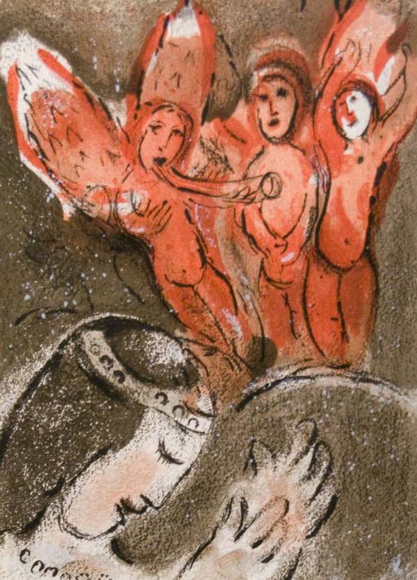 ![]() Сара и Ангелы Марк Шагал. Париж, 1960 г. Литография, бумага. 52,5x38 см «Он (Авраам) возвел очи свои и взглянул, и вот, три мужа стоят против него… И сказали ему: где Сара, жена твоя? И сказал один из них: … и будет сын у Сары, жены твоей. А Сара слушала у входа в шатер, сзади его». (Первая книга Моисея Бытие 18, 2 9-10)