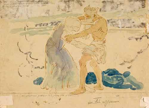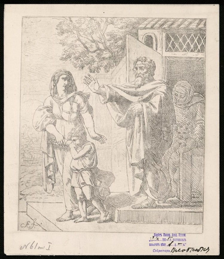 ![]() Авраам изгоняет из дома Агарь с сыном ее Измаилом. Козьма Никифорович Кудрявцев (1855(7?)-1885). 1878 г. Частное собрание Картина была удостоена Большой золотой медали Академии художеств |
