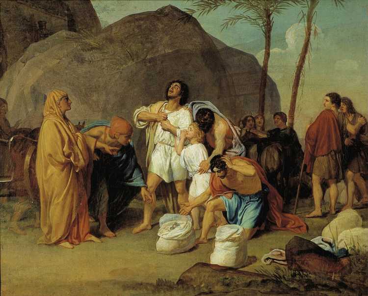 Иосиф, узнавший братьев, но которые не опознали его в богатом вельможе, дал гостям хлеба и велел привезти в Египет Вениамина, оставив в залог одного из братьев. Когда привезенные запасы закончились, братья еле-еле уговорили отца отпустить с ними Вениамина и снова отправились за хлебом.