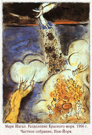 Евреи, по выходе из Египта, направились к Чермному, или Красному морю. Египтяне же, похоронивши умерших первенцев, стали жалеть, что отпустили евреев. Фараон, собрав войско с колесницами и всадниками, отправился в погоню за евреями. Он догнал их у берега моря. Увидев позади себя грозные полчища фараона, евреи пришли в ужас. Вместо того, чтобы просить у Бога помощи, они стали роптать на Моисея за то, что он вывел их из Египта. Ободряя их, Моисей в душе своей молился Богу. Господь услышал его молитву. Облачный столп стал позади евреев и скрыл их от египтян. Господь сказал Моисею: «возьми жезл твой, простри руку твою на море и раздели его». Моисей протянул руку свою с жезлом на море. И поднял Господь сильный восточный ветер на всю ночь, и расступились воды. И пошли евреи по сухому дну, вода же была им стеною по правую и по левую сторону. Слыша в стане еврейском движение, египтяне погнались за евреями по дну морскому и уже достигли середины моря. В это время евреи вышли на другой берег. Моисей снова, по повелению Божию, простер руку свою с жезлом на море. Вода морская слилась и покрыла колесницы и всадников всего войска фараонова, и потопила египтян.