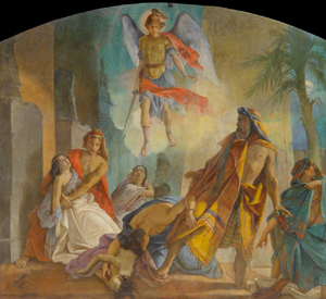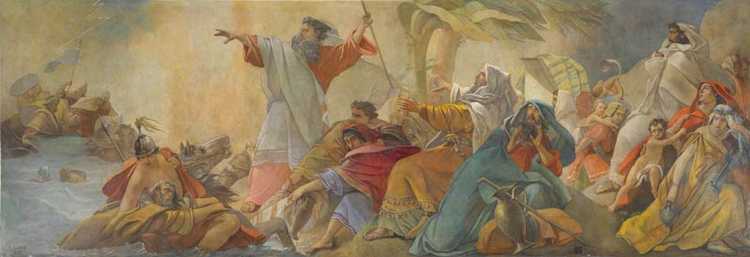 Сюжет из Ветхого Завета. Моисей ведет народ по дну Красного моря, воды которого расступились, пропуская беглецов, а затем сомкнулись над войском фараона. Картину отличает смелое диагональное построение, уравновешенность обеих частей и связь с архитектурной поверхностью.
