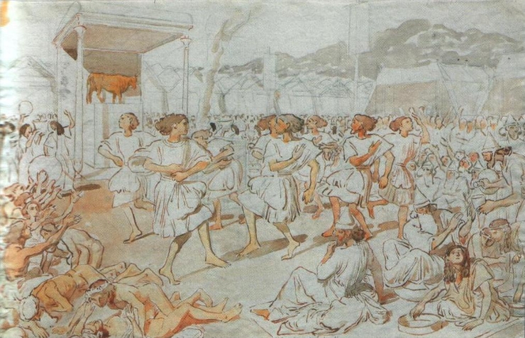Однако, пока Моисей беседовал с Богом на горе Синай, народ, оставшийся без вождя, потребовал от Аарона, брата Моисея, сделать им видимого и осязаемого бога. «Когда народ увидел, что Моисей долго не сходит с горы, то собрался к Аарону и сказал ему: встань и сделай нам бога, который бы шел перед нами, ибо с этим человеком, с Моисеем, который вывел нас из земли Египетской, не знаем, что сделалось. И сказал им Аарон: выньте золотые серьги, которые в ушах ваших жен, ваших сыновей и ваших дочерей, и принесите ко мне. И весь народ вынул золотые серьги из ушей своих и принесли к Аарону. Он взял их из рук их, и сделал из них литого тельца, и обделал его резцом. И сказали они: вот бог твой, Израиль, который вывел тебя из земли Египетской! Увидев сие, Аарон поставил пред ним жертвенник, и провозгласил: завтра праздник Господу.