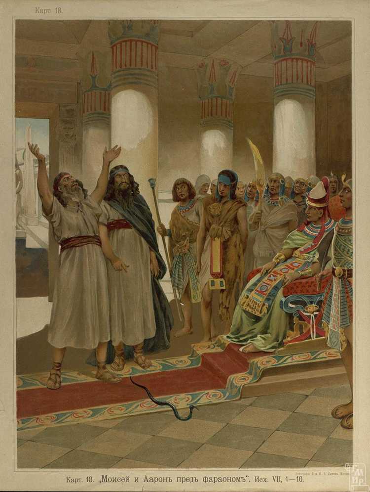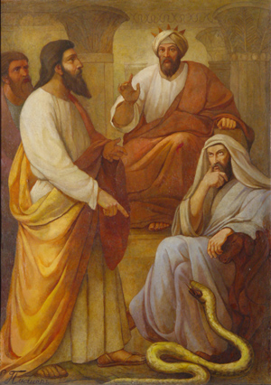 Сюжет о превращении жезла Аарона в змея описан в книге «Исход» (Исх. 7:10–13): «Моисей и Аарон пришли к фараону [и рабам его] и сделали так, как повелел [им] Господь. И бросил Аарон жезл свой пред фараоном и пред рабами его, и он сделался змеем. И призвал фараон мудрецов [Египетских] и чародеев; и эти волхвы Египетские сделали то же своими чарами: каждый из них бросил свой жезл, и они сделались змеями, но жезл Ааронов поглотил их жезлы. Сердце фараоново ожесточилось, и он не послушал их, как и говорил [им] Господь».