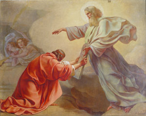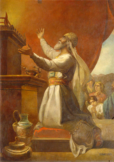 Сюжет из Ветхого Завета, посвященный искуплению греха золотого тельца. Аарон принес требуемые Богом жертвы в виде теленка и, подняв руки к небу, благословил народ. Господь принял жертву и явил славу Свою — огонь сжег жертву на жертвеннике. Народ с благоговейным страхом смотрел на чудесное проявление Божественного могущества.