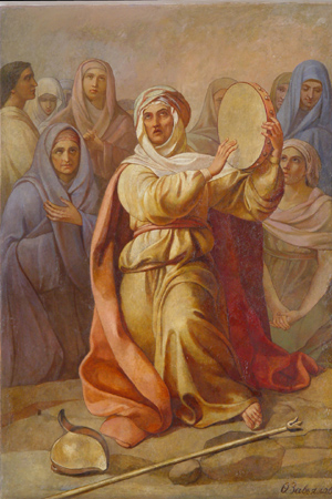 Тогда израильский народ (евреи) с великою радостью, воспели благодарственную песнь Господу Богу, своему Помощнику и Покровителю. Мариам же пророчица, сестра Ааронова, взяла в руки тимпан, а за нею вышли и все женщины с тимпанами и ликованием. И воспела Мариам пред ними: «Пойте Господу, ибо высоко превознесся Он, коня и всадника его ввергнул в море».