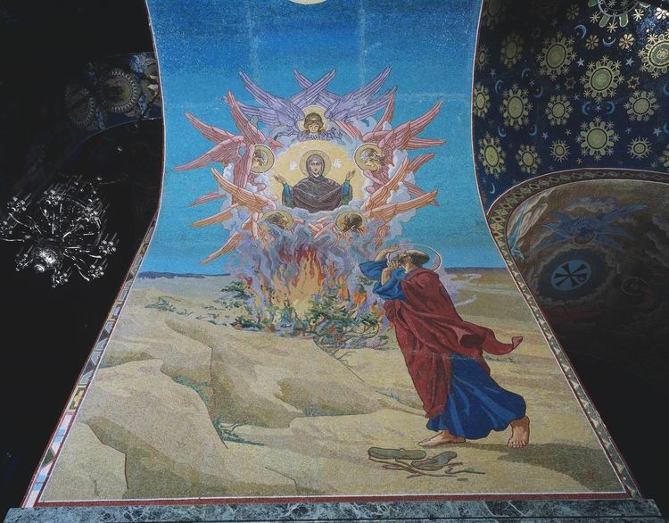 Куст, не сгоравший в огне, который видел Моисей при явлении ему Бога, получил название: «Неопалимая Купина». Он изображал собою избранного еврейского народа, притесняемого и не гибнущего. Он был также прообразом Божией Матери, Которую не опалил огонь Божества Сына Божия, когда Он сошел через Нее с неба на землю, родившись от Нее. Закон Божий протоиерея Серафима Слободского