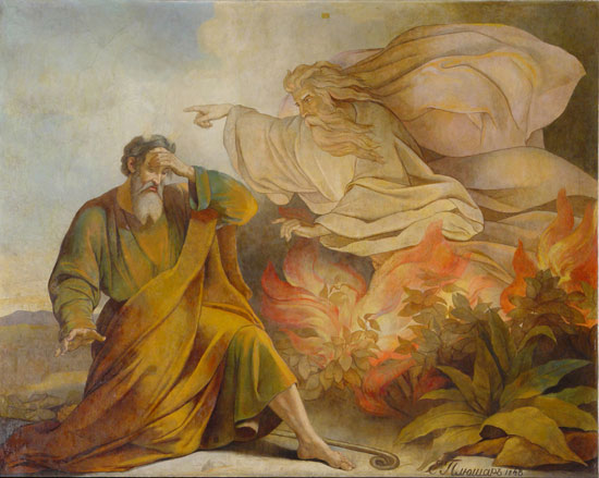 Моисей закрыл лицо свое, потому что боялся посмотреть на Бога. Господь сказал ему: «Я увидел страдания народа моего в Египте и услышал вопль его и иду избавить его от руки египтян и ввести в землю ханаанскую. Иди к фараону и выведи народ Мой из Египта». При этом Бог дал Моисею силу творить чудеса. А так как Моисей был косноязычен, то есть заикался, то Господь дал ему в помощь брата его Аарона, который бы говорил вместо него.
