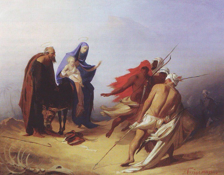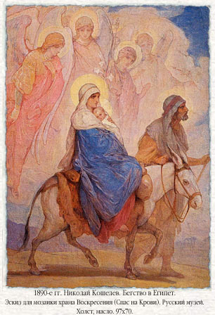Популярный в западном изобразительном искусстве и достаточно редкий для русской живописи библейский сюжет бегства Святого семейства в Египет отражает события после Рождества. Упоминание о бегстве в Египет содержится только в Евангелии от Матфея. После того как волхвы, принеся свои дары младенцу Иисусу, не вернулись к царю Ироду праведному Иосифу во сне явился ангел, повелевший: «встань, возьми Младенца и Матерь Его и беги в Египет, и будь там, доколе не скажу тебе, ибо Ирод хочет искать Младенца, чтобы погубить Его» (Мф.2:13). Иосиф выполнил это распоряжение и ночью с Девой Марией и младенцем Иисусом пошёл в Египет, где находился до смерти Ирода.