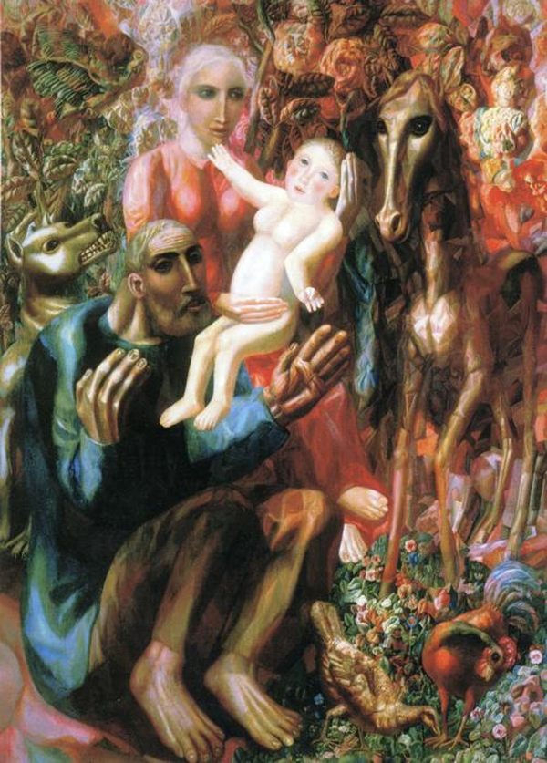 Полотно «Крестьянская семья», созданное в 1914 году, имеет второе, очень важное для понимания мировоззрения мастера название — «Святое Семейство». Картина близка к традициям примитивизма: крупные, несколько неуклюжие фигуры главных героев окружены условной моделью пейзажа — яркими цветами и травами. Персонажи кажутся будто сложенными из абстрактных по форме мелких деталей, «атомов и молекул», которые, в свою очередь, образуют сложную мозаику. Фигуры людей неподвижны, но мир вокруг них пребывает в постоянном движении крохотных частиц. Эта картина воплощала давние мечты художника о будущем воцарении справедливости и добра на земле, в котором патриархальная крестьянская семья — и есть «святое семейство».
