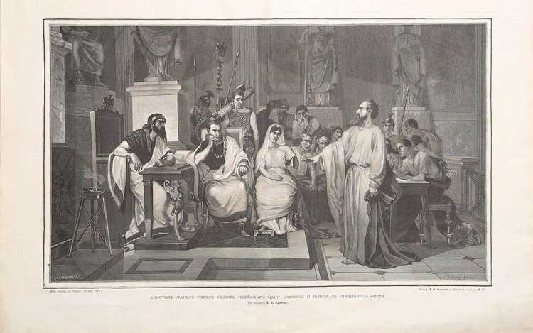 "На другой день, когда Агриппа и Вереника пришли с великою пышностью и вошли в судебную палату с тысяченачальниками и знатнейшими гражданами, по приказанию Феста приведен был Павел. И сказал Фест: царь Агриппа и все присутствующие с нами мужи! вы видите того, против которого всё множество Иудеев приступали ко мне в Иерусалиме и здесь и кричали, что ему не должно более жить. Но я нашел, что он не сделал ничего, достойного смерти; и как он сам потребовал суда у Августа, то я решился послать его к нему. Я не имею ничего верного написать о нем государю; посему привел его пред вас, и особенно пред тебя, царь Агриппа, дабы, по рассмотрении, было мне что написать. Ибо, мне кажется, нерассудительно послать узника и не показать обвинений на него. Агриппа сказал Павлу: позволяется тебе говорить за себя. Тогда Павел, простерши руку, стал говорить в свою защиту". (Деян. 25, 23–27; 26, 1)