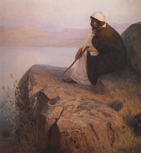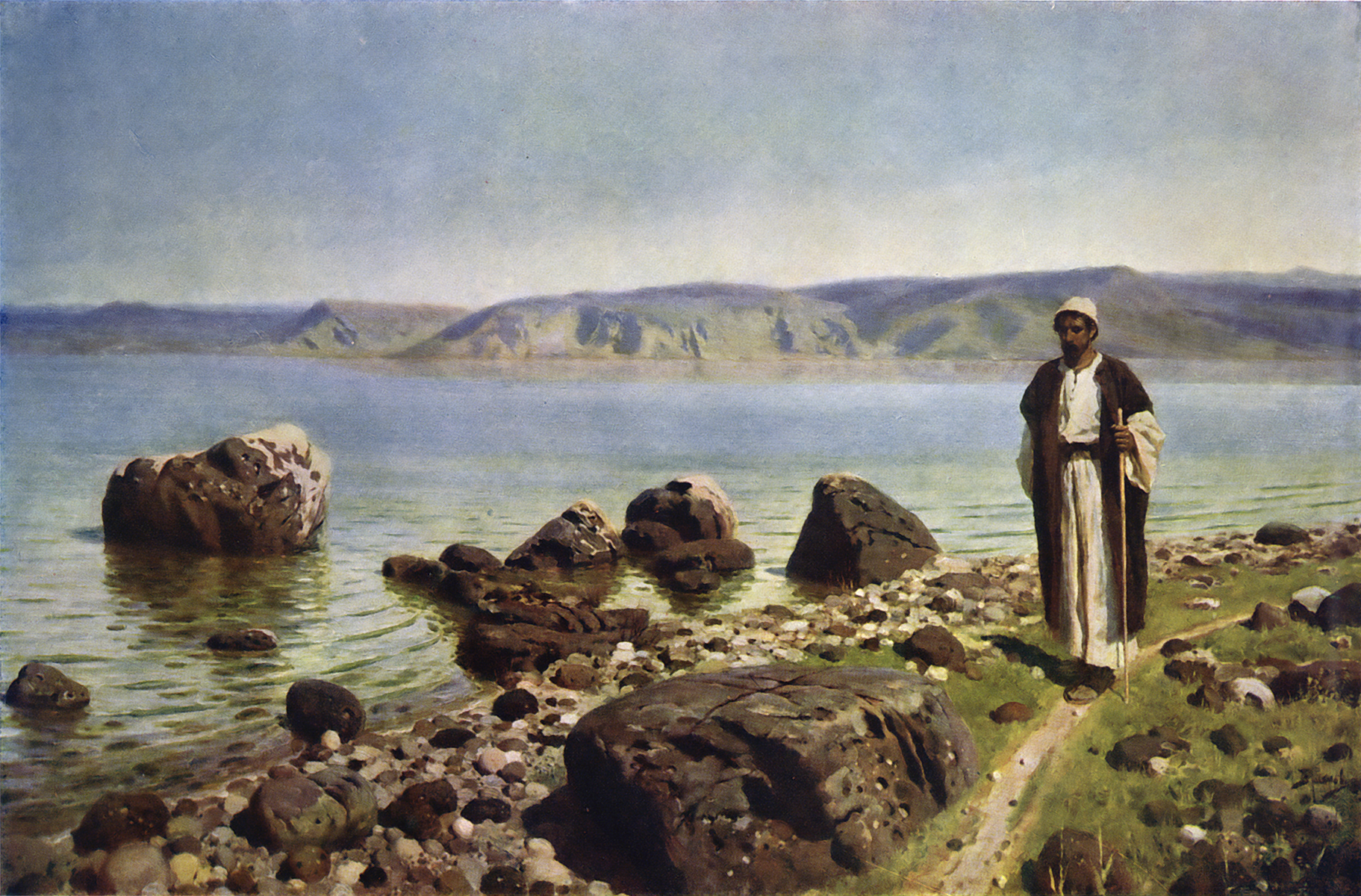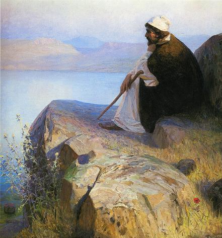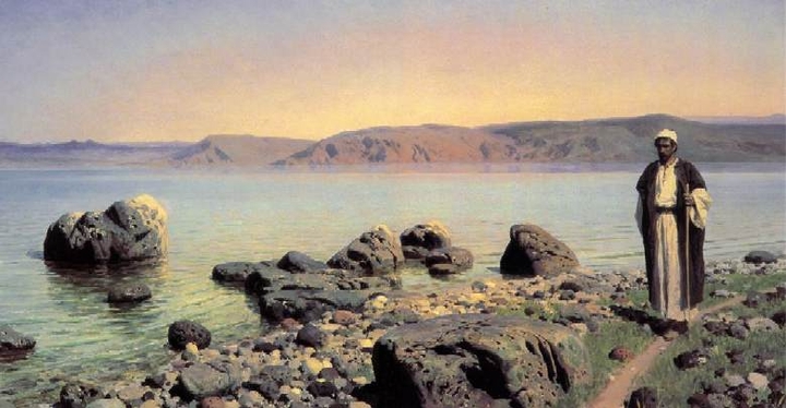 головою на руку, и смотрит вдаль; перед Ним гладкая поверхность Тивериадского