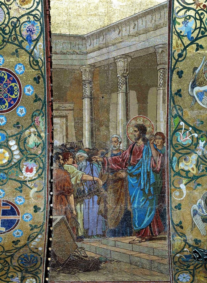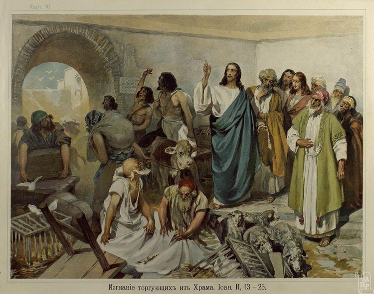 И вошел Иисус в храм Божий и выгнал всех продающих и покупающих в храме, и опрокинул столы меновщиков и скамьи продающих голубей, и говорил им: написано, – дом Мой домом молитвы наречется; а вы сделали его вертепом разбойников. Евангелие от Матфея