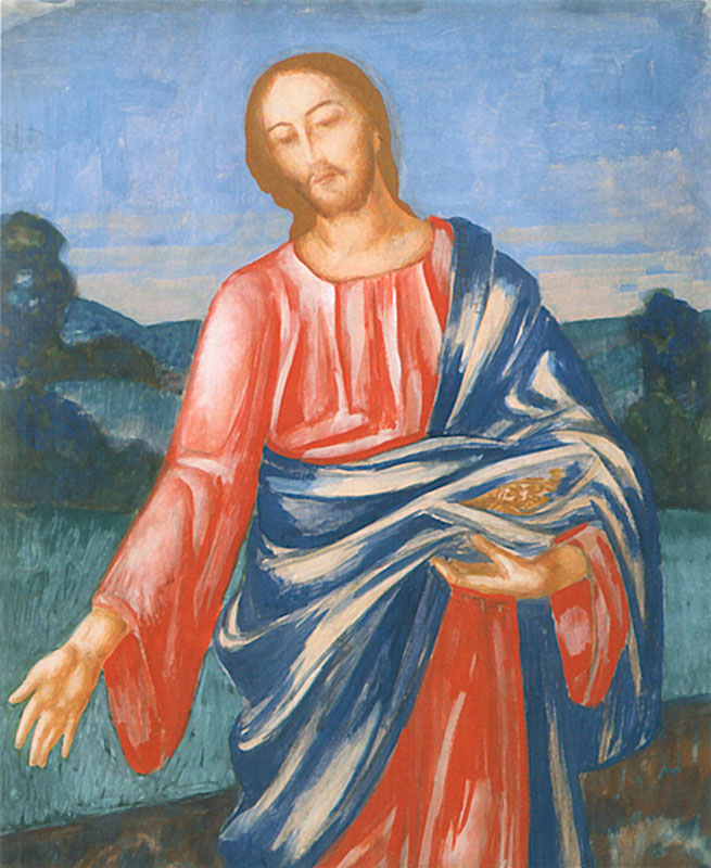 Христос предстает перед зрителем в полный рост (причем его стопы находятся примерно на уровне глаз смотрящего) в виде сеятеля, бросающего зерна в пашню. Как видим, сюжет, взятый художником, не является каноничным в православной иконографии. Движение Христа естественно и грациозно. На его божественную природу указывает только свечение вокруг головы, а также внешние иконографические признаки лика и окраска одеяния. Решение головы Христа напоминает о поисках монументальной формы Петрова-Водкина начала 10-х гг. ХХ в. Достаточно сопоставить голову мальчика в «Купании красного коня» (1912) и голову Христа, чтобы выявить параллель обобщенного, несколько условного подхода к отдельным частям лика и особенного индивидуального прочтения взгляда и в том, и в другом случае. Именно на движении глаз сосредотачивается выразительность, живость лика, его внутренний смысл. Голова Христа, склоненная к вытянутой руке, его взгляд, направленный в ту же сторону, что и жест, подчеркивают сосредоточенность и значимость совершаемого действа.