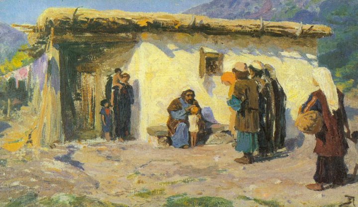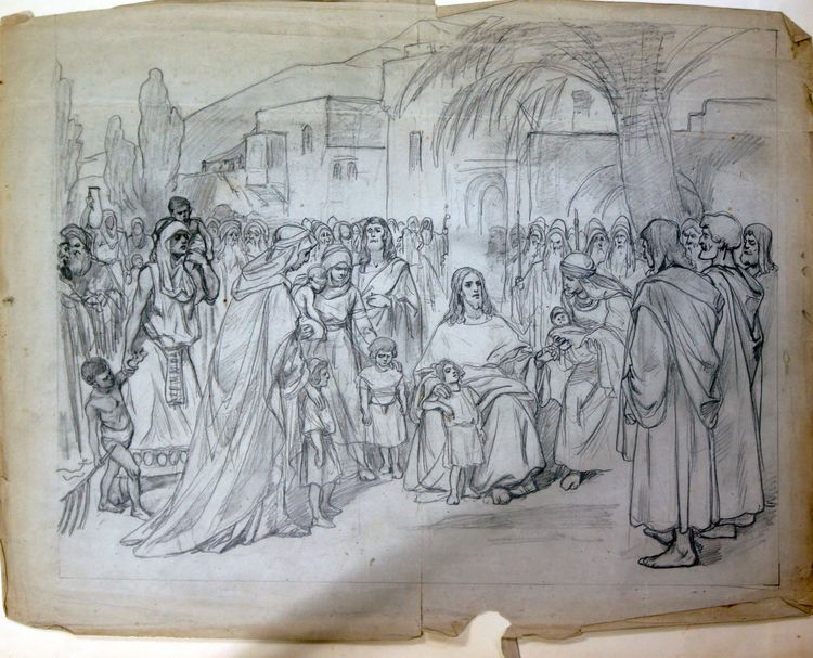 Комментарий В. Д. Поленова: «Небольшой домик в Иудее; Иисус сидит у стены дома; перед Ним ученики и родители с детьми; последних привели к Иисусу с просьбой возложить руки; Иисус ласкает стоящего перед Ним ребенка».