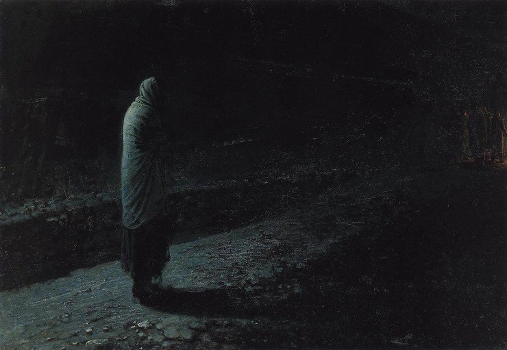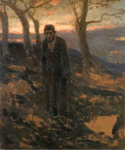 …Через много лет Николай Ге напишет картину «Совесть. Иуда», изобразив ученика, предавшего своего Учителя, как невнятную, закутанную фигуру со спины: Иуда смотрит в одиночестве на пропадающие во тьме, едва заметные силуэты удаляющихся апостолов и стражников, ведущих Христа. Перед нами не человек, а некое существо на пороге страшного решения – самоубийства. «Иуда мне представляется предателем, первообразом предательства при прогрессе, часто при совершенствовании, а оно есть у всякого желающего быть человеком. Старые низшие потребности, плотские, делают бунт и восстают на человека, и вот он по слабости уступает – вот и предательство. Я сделал так. Христа повели и ведут с факелами; группа эта очень далеко и скоро исчезнет; за ней бегут Петр и Иоанн. В большом расстоянии идет тихо Иуда. Он не может бросить, должен идти, но вместе с тем ему нельзя идти, и вот эта нерешительность выражается вполне в этой одинокой фигуре, идущей по той же дороге. Он и дорога залиты лунным светом, а группа удаляющегося Христа вдали по дороге освещена факелами. Ученики же бегут, еще освещенные луной, вот картина. Сегодня окончательно устроил; и все, и я сам чувствую, что правдиво, просто и вероятно…» – писал Николай Ге своему знакомому в конце января 1891 года, работая над картиной в уединении на своем хуторе.