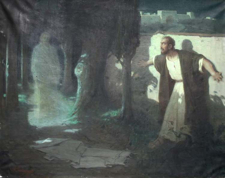 Иногда он как бы украдкой брался за холсты и писал сцены при лунном свете, без композиции, без обработки, определив интересно только название картины, например, — «Совесть». Без комментария ничего нельзя было понять в этом холсте среднего размера. Плохо нарисованная, бесформенная спина; примитивно протянутая наискось дорога, под черным фоном пригорка, в глубине красные кляксы и черные черточки. Это должно было изображать Иуду, прикованного взором мучительной совести к жертве своего предательства — Христу, уводимому толпою с дрекольями и факелами. И. Репин «Н. Н. Ге и наши претензии к искусству» («Нива», 1899, приложения № 15)