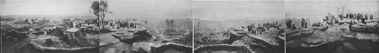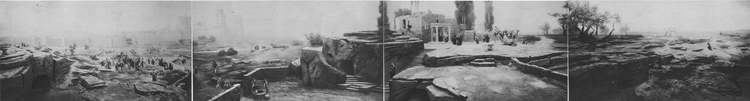 Прежде всего рассмотрим место, на котором произошло мучение и кончина Того, Кто возвестил Слово Божие и принес спасение роду человеческому. Возвышение, с которого видна картина, приходится на том месте, где в действительности стоит храм Гроба Господня. Виды окрестности, которые представляются нашим глазам, если смотреть с возвышения, отвечают действительности, так как они срисованы художником с купола храма Гроба Господня. Взойдя на возвышение, мы становимся лицом на восток. Повернувшись к юго-востоку, а потом несколько вправо, мы видим лишенную растительности скалу, составленную из огромных глыб почерневшего известняка, на этой скале стоят три креста — это Голгофа или Голгафа, а в действительности по-еврейски Голголифа, т. е. место наказания, «место лобное» (Еванг. от Луки. XXIII, 33), по-латыни место это называлось Кальварией, что означает то же самое.