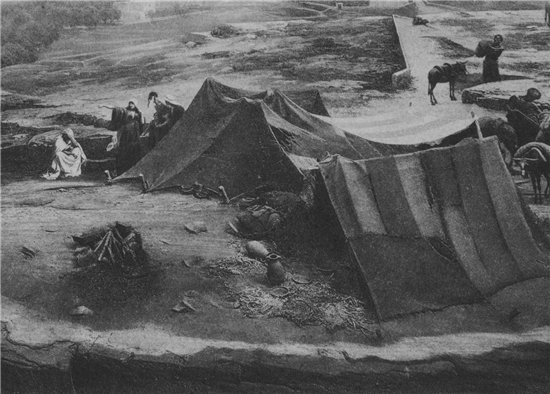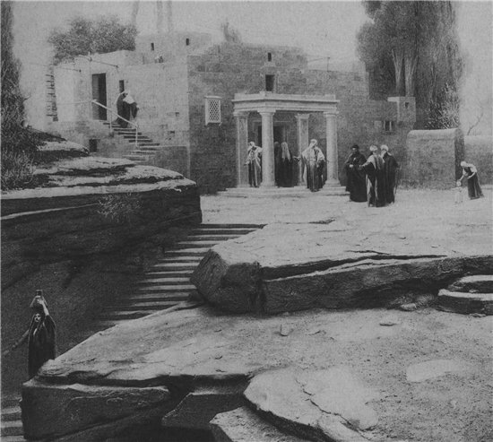 Направо от царских гробниц за домом с садом видны желтеющие скалы песчаника с высеченными в них четырьмя пещерами. В первой из них, самой большой, скрывался по преданию пророк Иеремия и пел свои величественные псалмы о падении Иерусалима. Вся окрестность усеяна деревенскими домиками, утопающими в зелени пальмовых, оливковых и кипарисовых деревьев, которые ласкают наше зрение.