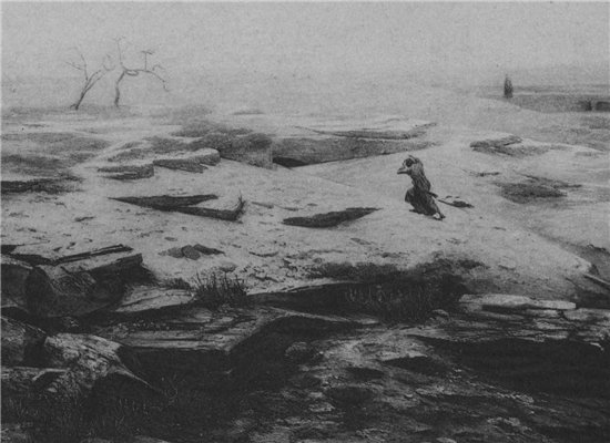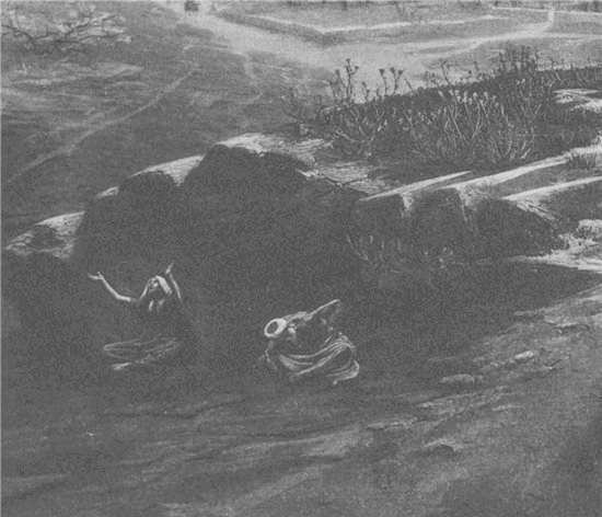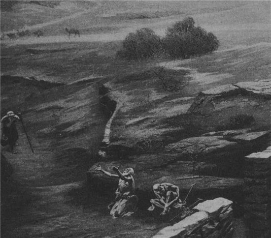 Шум шагов его долетел до слепой прокаженной, сидящей под скалою, на которой видно высохшее фиговое дерево; прокаженная простирает вверх руки и жалобным голосом просит милостыни. Старик не обращает внимания на прохожего, занятый осмотром своей ноги.