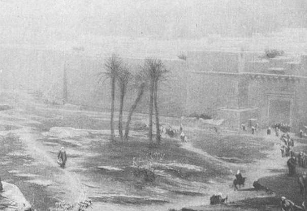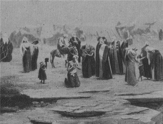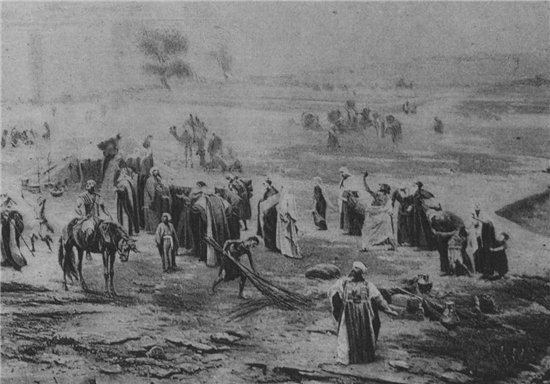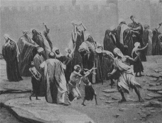 У городской стены виден недалеко от ворот целый ряд лавочек. Везде бродят ослы, отдыхающие верблюды. Все это оживление показывает, что, по случаю праздника Опресноков, в Иерусалим стеклись купцы и другой торговый люд, который оживленно болтает о своих делах у городских стен. Кроме евреев, здесь бродят и чужеземцы: Арабы, Финикияне и черные невольники. Больше всего несчастных прокаженных, которым слово закона запрещало вход в город.