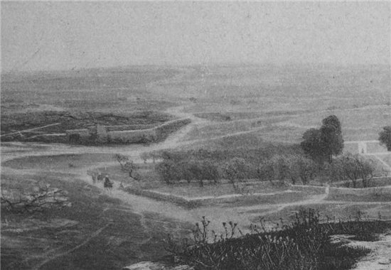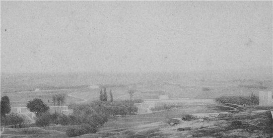 За Голгофой простирается Иерусалим, а за ним по направлению к юго-востоку на самом конце горизонта, сверкают Моавитские известковые горы, носящие название от языческого племени Моавитян. Этот народ во время правления Судей восемнадцать лет господствовал над Израильтянами, а в царствование Давида платил им дань.