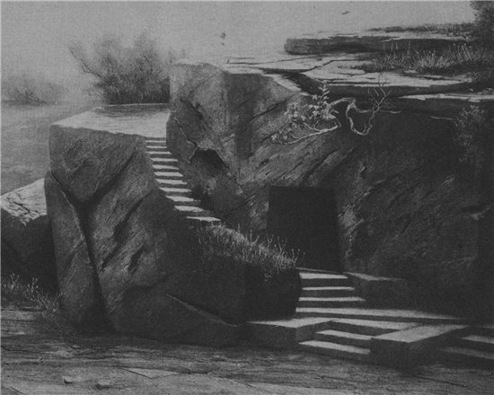 У самой скалы видны конные воины, разгоняющие народ. Вся картина погружена в полумрак, так как она изображает конец затмения. Св. евангелист Матфей говорит: