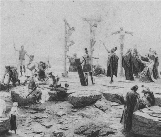 На равнине между Голгофой и стенами города бродит разношерстная толпа. Одни возвращаются в Иерусалим Судными воротами, другие останавливаются на дороге с проклятиями и слезами на глазах. Впереди виден полуголый оборванец со сжатым кулаком, которым он грозит Голгофе.