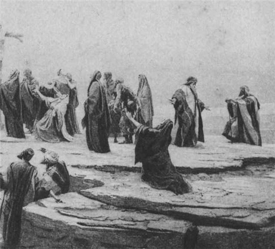 На склоне горы толпа зевак, состоящая из арабов и других иноземцев. Налево от них, на плоской скале, стоят два члена Синедриона и с ними седобородый первосвященник, который ругает двух плачущих женщин.