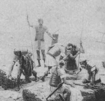 Тканый хитон лежит на земле, а один из воинов бросает, стоя на коленах, кости.