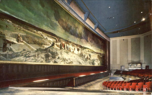 Это уже вторая жизнь панорамы. В 1904 году Ян Стыка привез ее в Америку на выставку в Сан-Луисе, но возникли проблемы с помещением. Ее негде было показать. Расстроенный художник собрался вернуться обратно в Европу, но на таможне его попросили заплатить налог, сумма которого оказалась не под силу ни ему, ни его компаньонам. Так конфискованная картина осталась в Америке, где ее в 1911 году некоторое время выставляли в зале оперного театра в Чикаго, а потом свернутая вокруг телеграфного столба она провалялась сорок лет в театральном подвале, всеми позабытая, пока о ней не узнал доктор Хьюберт Итон, основатель Forest Lawn. В 1944 году он разыскал и купил полуразрушенную картину. Затем пригласил сына Яна Стыки Адама для ее реставрации, после чего выставил в своем парке в Страстную Пятницу 1951 года.