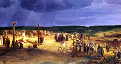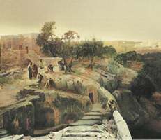 Слева от города виднеются каменные своды гробницы Иеровоама, основателя и первого царя Израильского царства (примерно с 960 до 930 лет до Иисуса Христа). Рядом с гробницей видны четыре женские фигуры, напуганные землетрясением, которое произошло в момент смерти Христа.