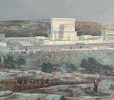 Панорама воспроизводит окрестности Иерусалима, раскинувшиеся на 80 км. Город виден с холма, расположенного западнее Иерусалима. В левой части города можно увидеть три главных здания. Первое – это ксистос, где упражнялись римские солдаты. Второе – в центре – башни крепости Антония, там в претории Иисус был осужден Понтием Пилатом, оттуда его повели на Голгофу. Третье – белые стены Иерусалимского храма, расположенного на Храмовой горе, она же гора Мориа. Высокая гора, виднеющаяся за городом – это Елеонская (Масличная) гора.
