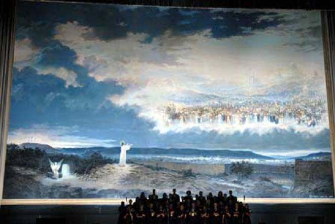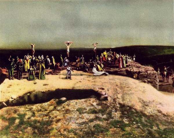 Именно так, отдельными картинами, выхваченными снопом света из полумрака, эту грандиозную картину и показывают в настоящее время в американском местечке Глендейле (Калифорния), где есть необычное кладбище, называемое Forest Lawn Memorial Park. В зрительном зале на 800 мест в полной темноте поднимается занавес, и луч прожектора освещает отдельные детали, группы и фигуры, изображенные на холсте, создавая иллюзию трехмерности и как бы ведя зрителя по страницам Евангелия. Все это сопровождается музыкой, пояснениями и евангельскими цитатами.