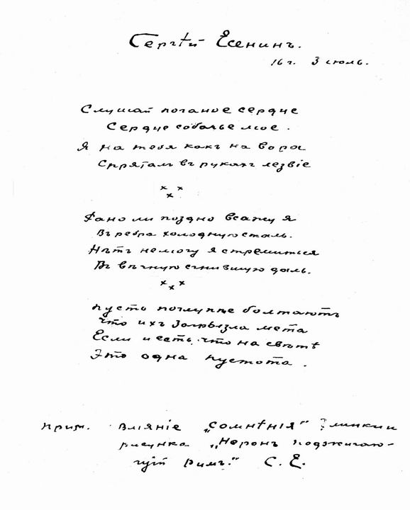 Сергей Есенин подошел к письменному столу, взял альбом и быстро без помарок написал следующее стихотворение: