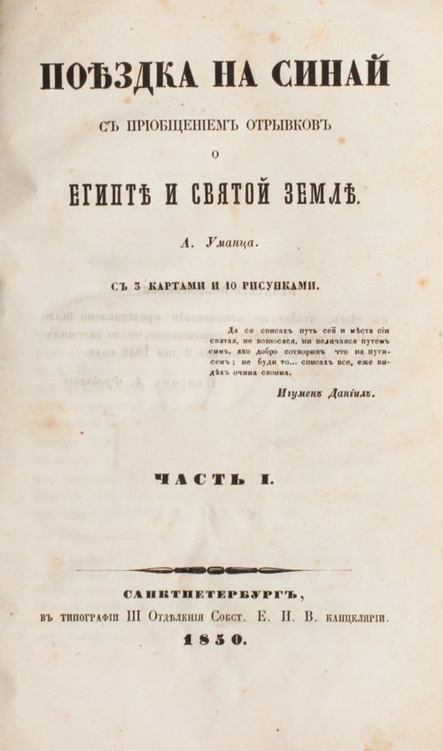 16. Уманец, А. А. Поездка на Синай с приобщением отрывков о Египте и Святой земле / А. А. Уманец. Ч. 1 – 2. – СПб.: тип. III Отд-ния Собств. е. и. в. канцелярии, 1850. – Ч. 1. – IX, [9], 292 с., 9 л. ил. карт.