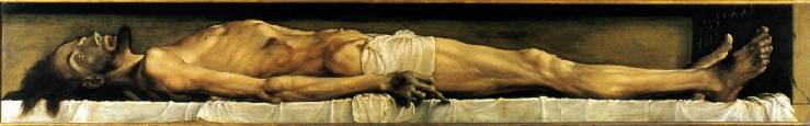 При взгляде снизу тело, нависающее над смотрящим, как бы расслабляется и обмякает, производя впечатление действительно — именно и только — страшно исхудавшего; закатившийся глаз остается мертво застывшим, скрюченная рука и странно изогнутые плечо и шея производят лишь впечатление растерзанности, какого-то изощренного мучительства, словно не прекратившегося и по смерти. Плечо и шея, словно искривленные, как-то смещенные в нескольких плоскостях, все же одновременно представляются застывшими, простертыми на нижней плоскости «гроба».