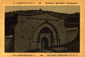 О месте погребения Богородицы. Оттуда до гроба Богородицы саженей сто. Гроб находится на ровном месте, в небольшой, высеченной в камне пещерке, с двумя, небольшими дверцами, как можно человеку, наклонившись, войти. На дне пещерки, напротив дверец, высечена из того же пещерного камня лавка, на которой было положено тело Богородицы и оттуда было взято нетленным в рай. Пещерка чуть выше человеческого роста, в ширину четыре локтя, квадратная. Снаружи она сделана теремцом, облицованным красиво мраморными плитами. Вверху над гробом создана была большая церковь со стрельчатыми сводами во имя Успения. Ныне же все разорено иноверцами. Гроб Богородицы — внутри, под великим алтарем той церкви»[13].