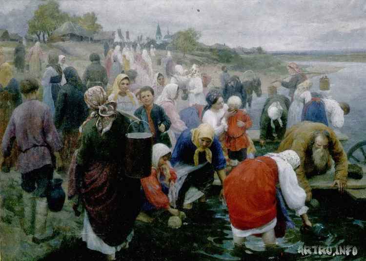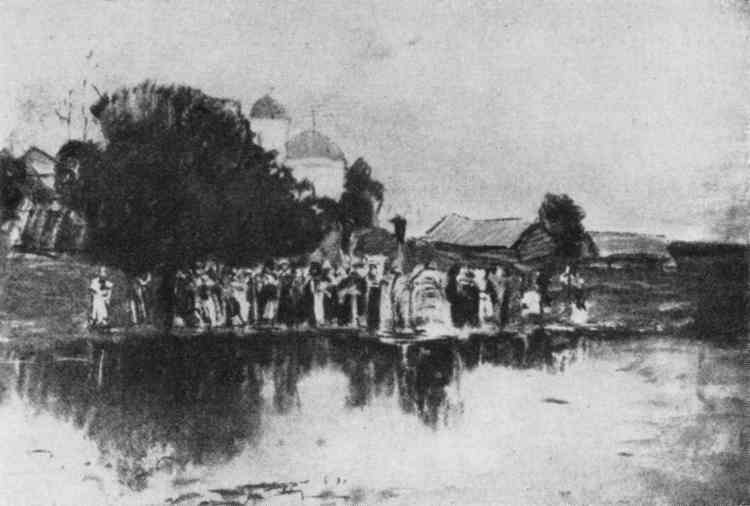 На переднем плане – крестьяне (подростки, мужчины, девки) верхом на лошадях, стоящие в реке в ожидании освящения воды. Молебен уже начался, но со всех сторон подтягиваются опоздавшие, справа по косогору скачут крестьяне, догоняют крестный ход пешие прихожане, под руки ведут немощных стариков. Однако их движение не нарушает общего впечатления спокойствия и размеренности происходящего, что позволяет говорить об укорененности в бытовом обиходе старинного православного обряда и устойчивости многовековой традиции. Вдали виднеется храм, откуда пришли крестным ходом нарядно одетые женщины в ярких платках и узорчатых национальных сарафанах, рослые мужчины в темных кафтанах, подпоясанные праздничными кушаками. Пестрое и шумное людское сборище на фоне бескрасочного неба и неяркой северной природы напоминает скорее народное гуляние, но возвышающиеся хоругви фиксируют композиционный центр полотна, как впрочем, и всадники, «отвернувшиеся от зрителя». Все разнообразное, только на первый взгляд, движение людей невольно стягивается к центру полотна. Геометрический и смысловой центр картины – священник, читающий Евангелие, и четко определяемые иконы Спасителя и Богоматери в серебряных окладах.