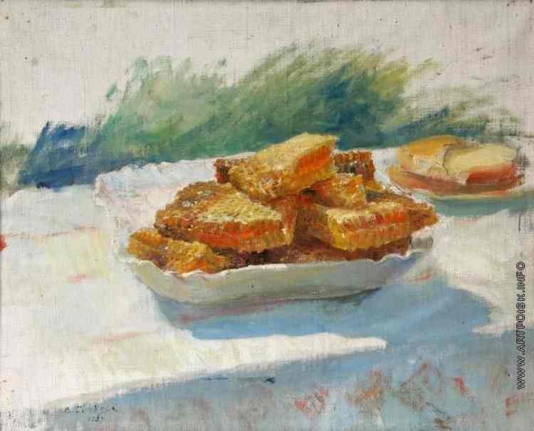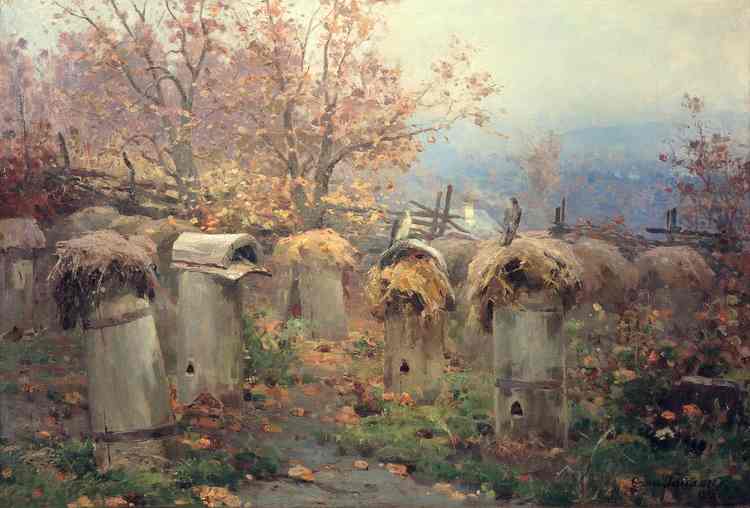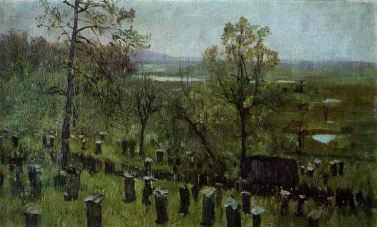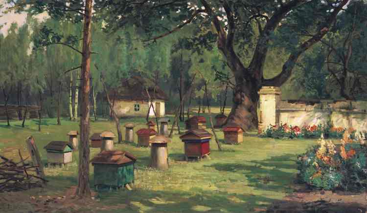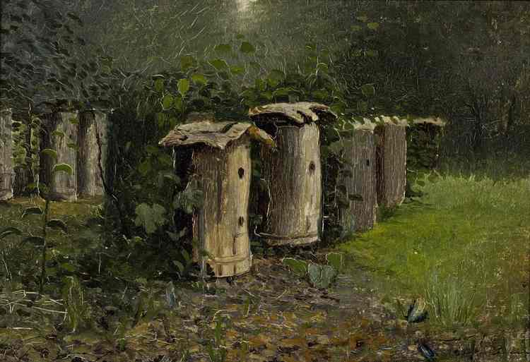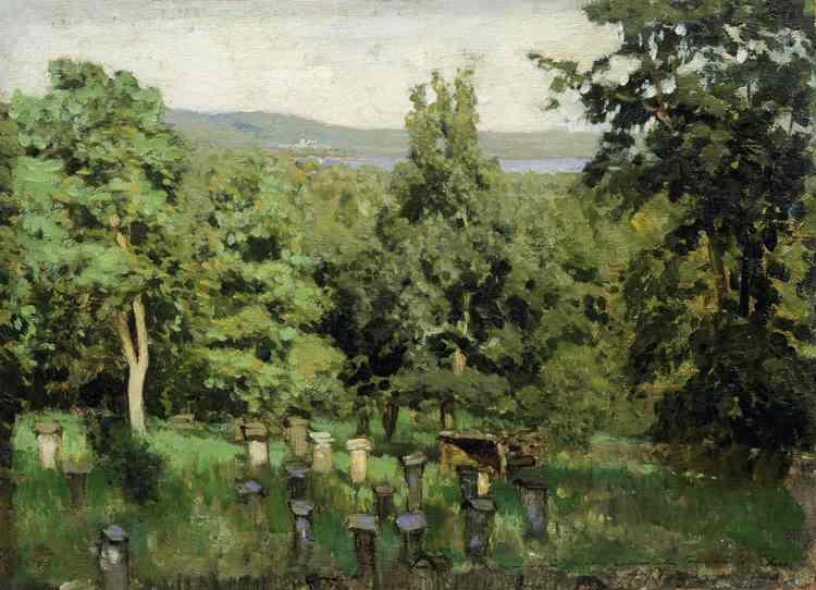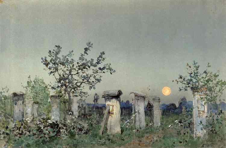 К этому мотиву Левитан обращался неоднократно. 1877 годом датирован пейзаж "Летний день. Пчельник". В ГТГ хранится картина 1880-х годов "Ульи" с дарственной надписью художника 1887 года. И каждая из этих композиций решена в особом цветовом и композиционном ключе. "Пасека" из собрания ГРМ по плотности красочного слоя тяготеет скорее к живописным работам художника. Композиция в приглушенной серо-зеленой гамме с единственным ярким пятном - оранжевым диском восходящей луны - удивительна по изысканности колористического решения и тонкости настроения. В передаче переходного "сумеречного" состояния природы она сродни таким поздним картинам Левитана, как "Стога. Сумерки" и "Сумерки".