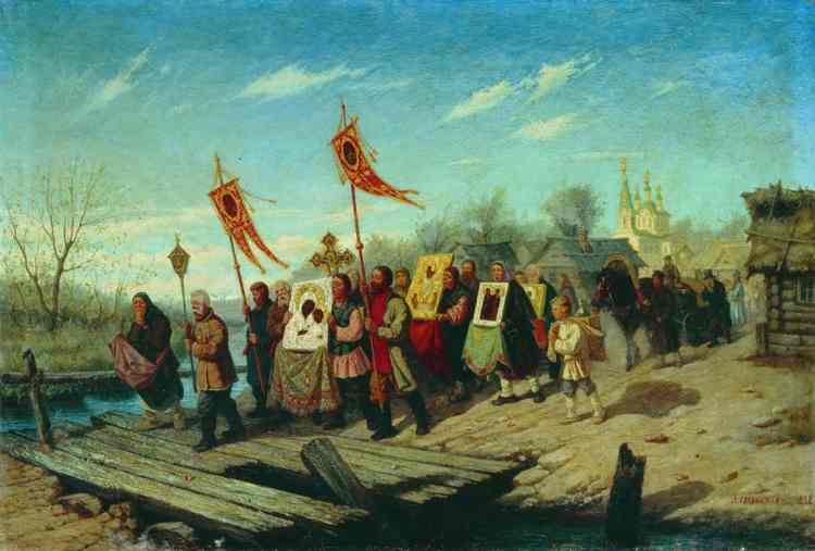 Кроме воспевания торжественности самого религиозного обряда, который может объединить совершенно разных людей, Прянишников не упустил возможности ещё раз признаться в восхищении одному из своих излюбленных мест – окрестностям северного городка Лальска. Именно церковь Покрова на Лузе близ Лальска возвышается над низкими хатами вверху картины.