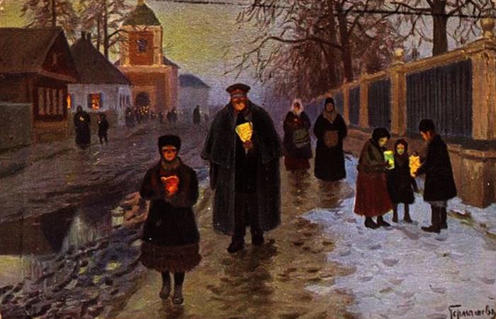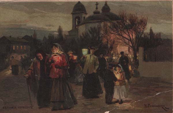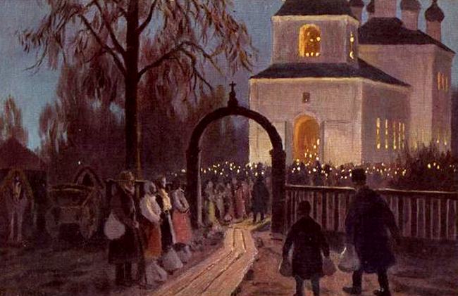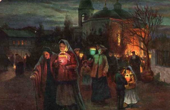 «Толпа стояла при входе и ждала самого торжественного момента — крестного хода… Большинство уже не претендует на вход в храм… Все расходятся группами по домам … и … все стараются донести свои зажженные свечи домой, чтобы засветить ими лампадки. … Кто-то смастерил особую ширмочку для защиты пламени от ветра. А в храме продолжается служба и длится почти всю ночь». Д. А. Засосов, В. И. Пызин. «Из жизни Петербурга 1890 — 1910-х годов. Записки очевидцев»
