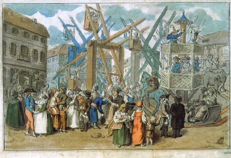 Из воспоминаний М. В. Нестерова: "Еще помнится такое: ранняя весна, Пасха. Посмотришь из залы в окно или выскочишь, бывало, за ворота, что там творится? А там празднично разряженный народ движется по улице к качелям. Еще задолго до Пасхи, бывало, станут возить на нашу площадь бревна, сваливать поближе к Аллейкам, - значит, пришла пора строить балаганы, качели и прочее. К первому дню Пасхи все готово, действует с шумом, с гамом, с музыкой. Народ валит туда валом. Солнце светит особо ярко. В воздухе несется радостный пасхальный звон. Все веселится, радуется, как умеет. Пьяных еще не видно, - они появятся к вечеру, когда все наслаждения дня - балаганы, качели - будут пережиты, когда горожане побывают друг у друга, попьют чайку, отведают пасхальных яств и питий. Вот тогда-то и пойдет народ с песнями, с гармоникой... "