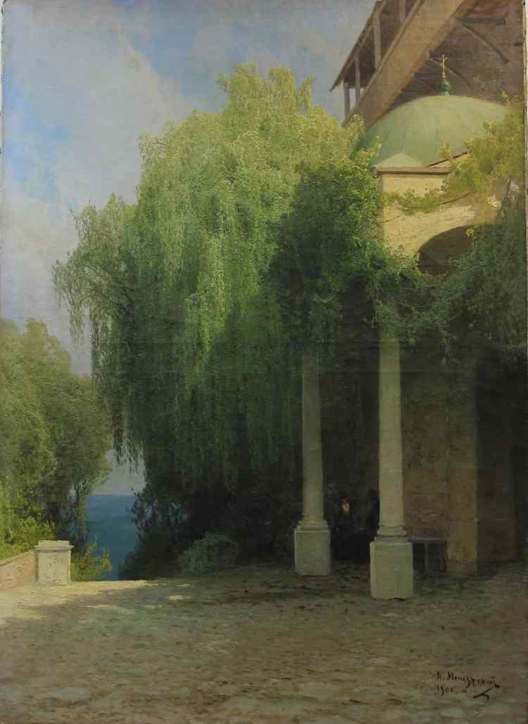 Менее эффектная, чем ранние "лунные ночи" художника, но тихая и проникновенная картина изображает "святое место" восточных христиан — Афон. Цельная, она в то же время более детализирована в обрисовке местности и ее своеобразного колорита. Залитые призрачным светом море и скалы вдали, крепостные укрепления на берегу, облик древней обители у поросшего обильной растительностью склона горы, свет лампады в окне, воспринимаемый как кроткая молитва Господу, мотив погруженного в чтение седобородого монаха на первом плане романтизируют прошлое и современность изображенного места, усиливают ощущение разлитой в мире благодати. Русский музей
