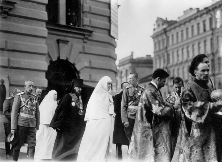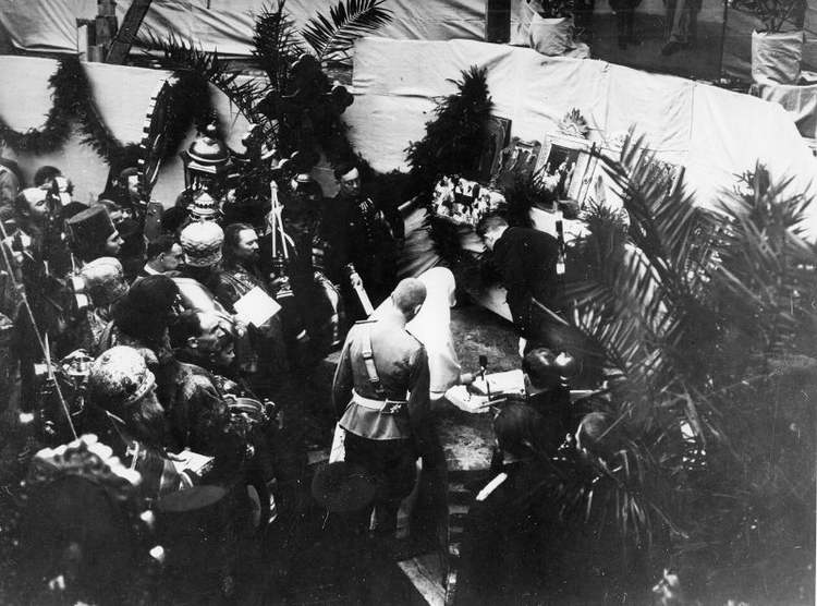 Председательница Палестинского общества, великая княгиня Елизавета Федоровна и сопровождающие ее лица во время молебна в честь закладки церкви святого Николая Чудотворца и благоверного великого князя Александра Невского (Николо-Барградской) при Императорском Палестинском обществе (C-Петербург, перекресток 2-й Рождественской ул., Калашниковского пр. и Мытнинской ул.). 8 сентября 1913 г.