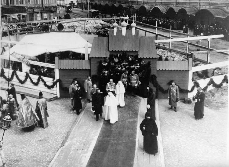 После сего его высокопреосвященство окропил св. водою место будущего престола, вложил в приготовленное место ковчежец с мощами св. Алексия и юбилейные монеты и залил их елеем. По водружении рабочими креста и мраморной закладной доски, владыка митрополит положил первый камень созидаемого во славу святителя Николая храма: вслед за митрополитом изволили положить камни великая княгиня Елисавета Феодоровна и князь Иоанн Константинович, а после Их Высочеств подходили, соблюдая очередь, присутствовавшие на торжеств лица и клали камень за камнем. В это время, сопутствуемый Великою Княгинею и лицами свиты Ее Высочества, митрополит Владимир обходил места, где намечено возведение стен храма, окропляя их св. водою.
