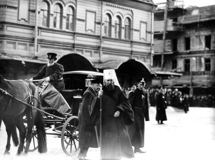Крестный ход, возглавляемый митрополитом Владимиром (Богоявленским), выходит из временной часовни в доме Галунова.