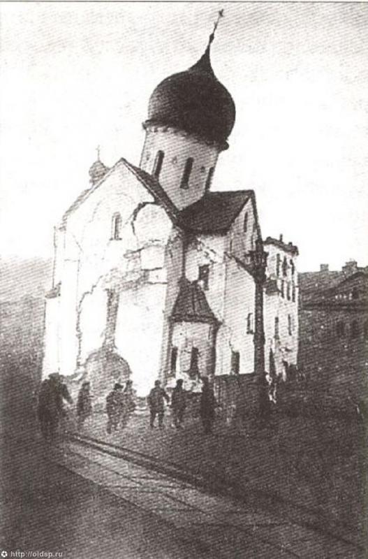 "Эта одноглавая церковь с небольшой звонницей над входом в сторону 2-й Советской улицы была как бы домашней для жителей окружающих домов. Кто-то ходил в нее постоянно, но все святили куличи и пасхи. Называли ее почему-то Скоропослушницей. Для транспорта она стояла не очень удобно, а рядом у Калашниковских складов всегда было много подвод. В конце 1931 или начале 1932 года церковь закрыли. По-видимому, кое-какое неценное имущество раздавали всем… После освобождения церкви рабочие начали долбить стены, довольно толстые. В результате церковь оказалась как бы на толстых столбах, разъединяющих арки. Ранним утром… столбы подорвали, и церковь почти целиком завалилась на бок в сторону Полтавской улицы. Говорили, что рассчитывали получить кирпичи для строящегося рядом большого дома между Невским, Бакунина и Полтавской, но не получилось. Церковь свалилась как монолит и только блеснул купол, в который мы, ученики 3-го класса ближней школы, полезли но наклонной внутренней стене (угол около 30-35°). Ломали стены на крупные блоки и постепенно увозили. Не помню, управились ли до зимы. А дом построили из крупного шлакового кирпича. Потом выправили трамвайные линии..."