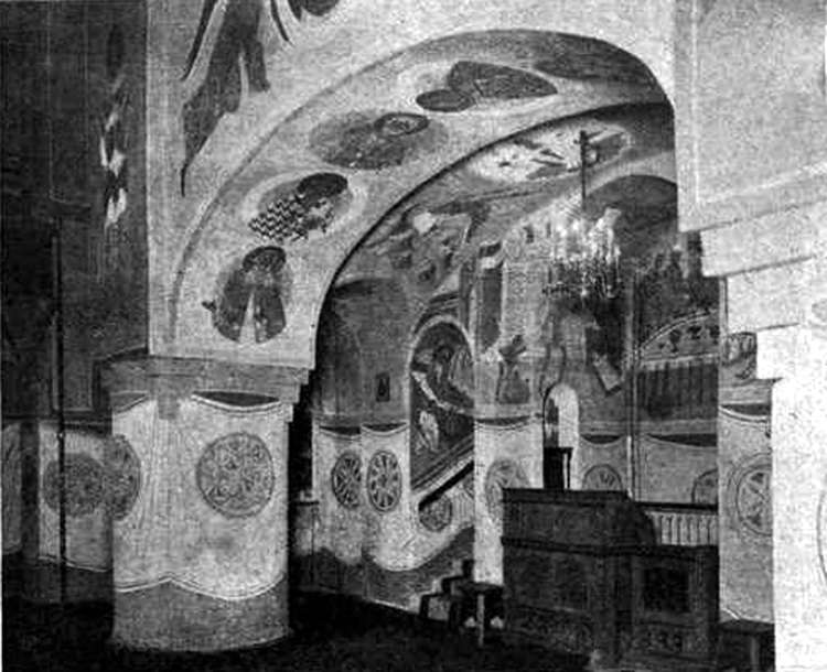 В соответствии с внешним видом храма решено было украсить и внутренние стены росписью. За образец были указаны открытые знатоком иконописи В. Т. Георгиевским стенные росписи, сохранившиеся доселе в Новгородском Ферапонтовом женском монастыре и принадлежащие кисти выдающегося художника времени великого князя Иоанна III Васильевича (1462–1505 гг.) Дионисия, который, как известно, трудился над росписями стен Московского успенского собора и Иосиф-волоколамского монастыря.
