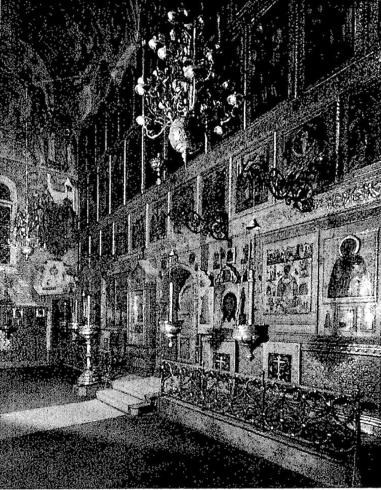 Самую драгоценную достопримечательность храма составляете его четырехъярусный иконостас и иконы по стенам храма и в алтаре. Иконостас сборный и честь его собрания всецело принадлежите вице-председателю Императорского Православного Палестинского Общества князю А. А. Ширинскому-Шихматову. В поисках за художественной стариной ему посчастливилось напасть на усердного и добросовестного московского собирателя и знатока иконного старинного письма М. И. Тюлина, который явился ближайшим исполнителем указаний князя А. А. Ширинского-Шихматова. Собрание иконостаса в одно целое и украшение его басмою, по образцу иконостаса московского успенского собора, было поручено пользующемуся в Москве заслуженною известностью «Товариществу И. П. Хлебников и Сыновья».