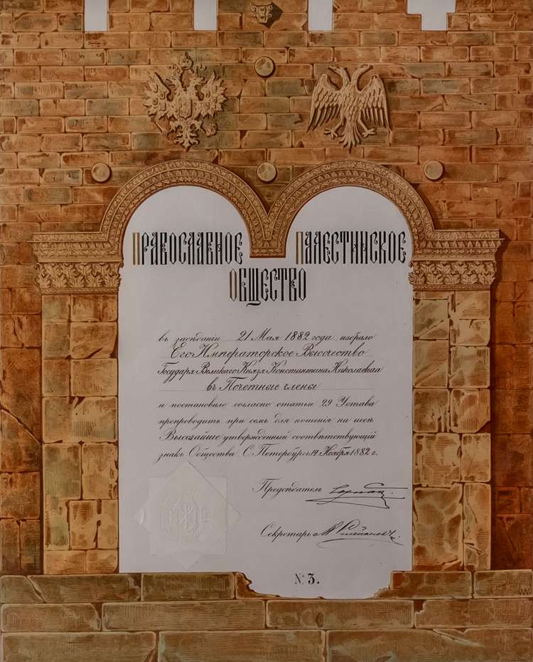Текст: "Православное Палестинское Общество в заседании 21 мая 1882 года избрало Его Императорское Высочество Государя Великого Князя Константина Николаевича в Почетные члены и постановило согласно статьи 29 Устава препроводить при сем для ношения на шее Высочайше утвержденный соответствующий знак Общества. С.Петербург. 14 Ноября 1882 г.".